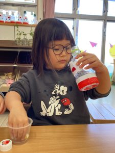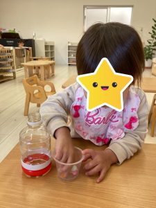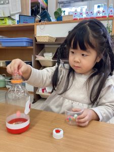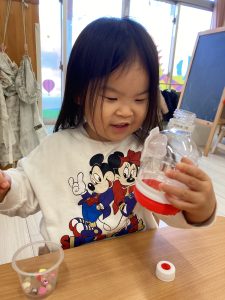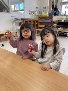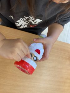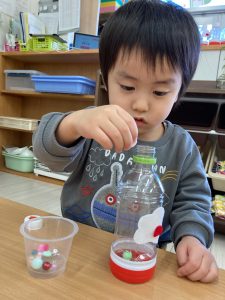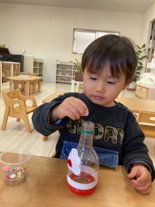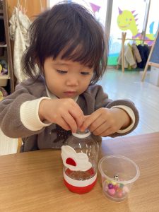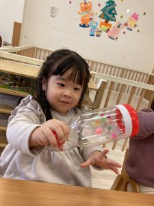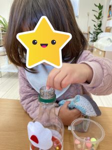 ペットボトルの中にビーズや鈴を入れました。指先が器用になったみんなは小さなビーズを上手につまんで入れることができましたよ。