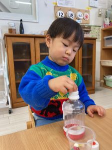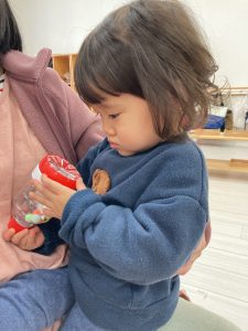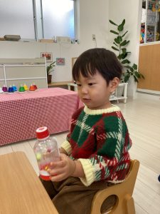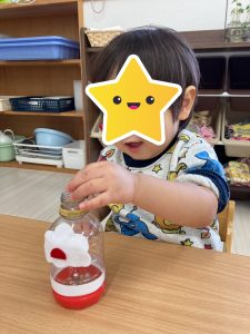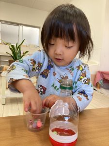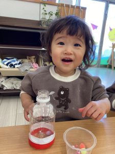 ペットボトルの底にビーズが当たって音がすると「わ!」と驚いたり笑顔になって喜んだり、「ハート!」「これは星!」とビーズの形に気づいたりしながら楽しみました。