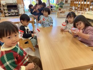 クリスマス会の前にサンタさんのマラカスを作りました。