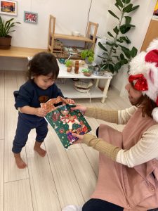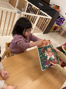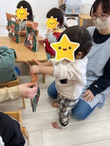 一人ずつ先生が手渡しに行く予定でしたが、プレゼントの袋を見るなり自分から受け取りに来てくれたお友だちもいました(^_-)-☆
