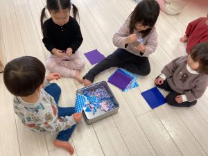 指先が器用になってきた子どもたちは、小さく小さくちぎることができるようになっていましたよ。