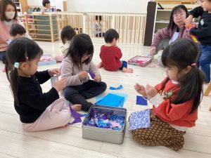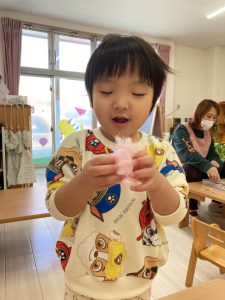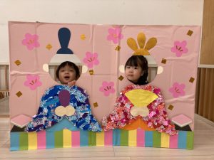 「おひなさまの着物を作ろうと思ってるよ」と答えると、「おひなさま〇〇ちゃんの家にも飾ってる!」「かわいいよねえ」とお話していました(*^-^*)