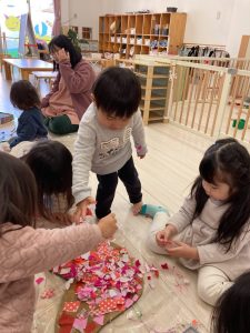 一つ一つ貼っていくより、上からぱらぱらと紙を散らすと速く貼れることに気づいたお友だちもいました。