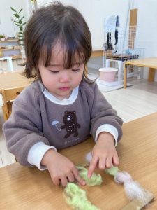 糸巻きを使って毛糸をぐるぐると巻き付けていきます。最初は同じ方向に糸巻きを動かしていくことが難しかったのですが、「こうかな??」「あれ、ちょっと違うかも・・」と試行錯誤しながら続けていくうちにコツをつかんでいましたよ。