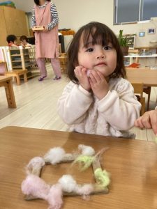 3色の毛糸の配置も、子どもたち自身で決めてそれぞれ素敵な作品が出来上がりましたよ★