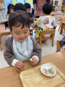 ひなまつり当日は朝のおやつにひなあられをみんなで食べましたよ。