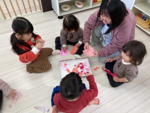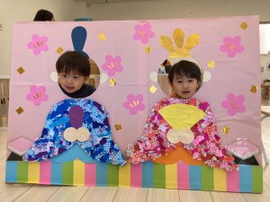 「おひなさまの着物を作ろうと思ってるよ」と答えると、「おひなさま〇〇ちゃんの家にも飾ってる!」「かわいいよねえ」とお話していました(*^-^*)