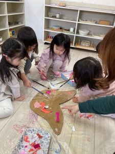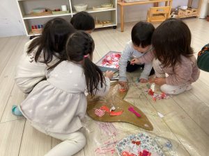 一つ一つ貼っていくより、上からぱらぱらと紙を散らすと速く貼れることに気づいたお友だちもいました。